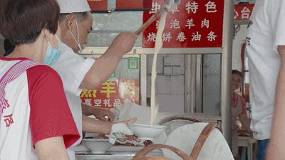 比如,陕西渭南豆腐泡馍店的阿姨。