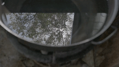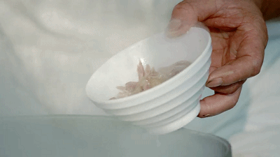 从冒着热气的铁桶里舀出一勺粥,手一提勺子快举到头顶了,粥却能从上往下稳稳当当地滑落到碗里。