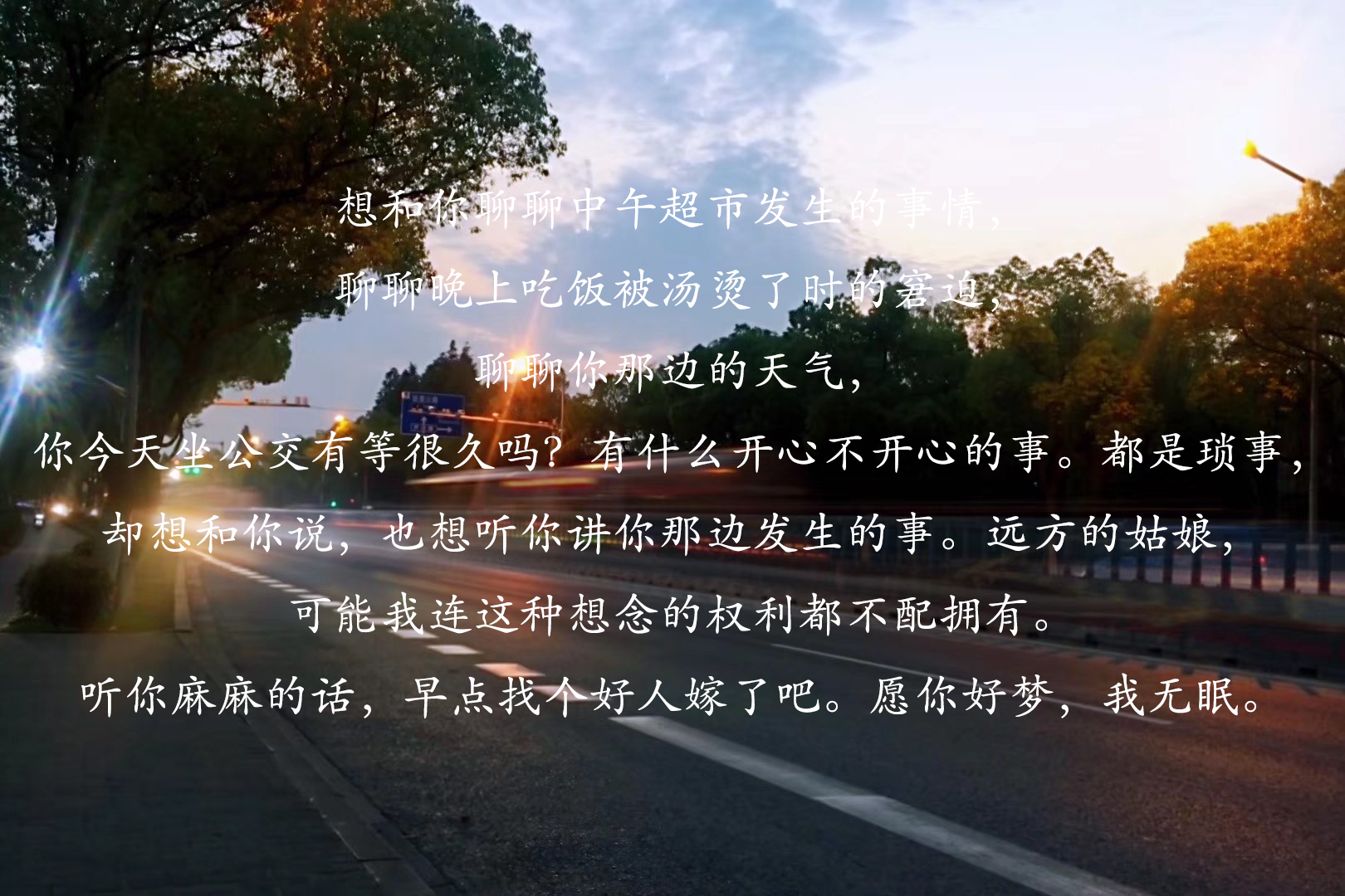 5、想和你聊聊中午超市发生的事情,聊聊晚上吃饭被汤烫了时的窘迫,聊聊你那边的天气,你今天坐公交有等很久吗?有什么开心不开心的事。都是琐事,却想和你说,也想听你讲你那边发生的事。远方的姑娘,可能我连这种想念的权利都不配拥有。听你麻麻的话,早点找个好人嫁了吧。愿你好梦,我无眠。