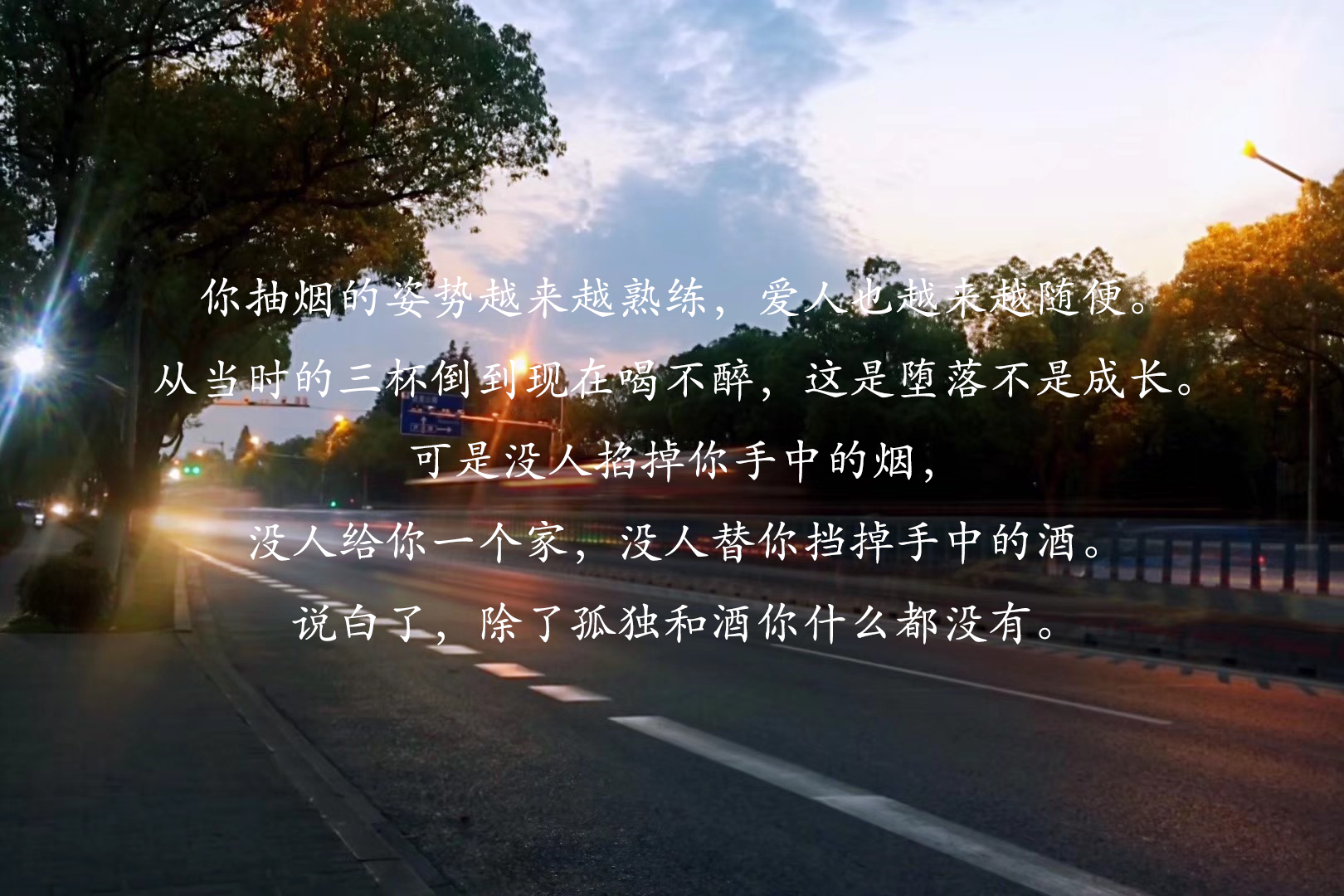 你抽烟的姿势越来越熟练,爱人也越来越随便。从当时的三杯倒到现在喝不醉,这是堕落不是成长。可是没人掐掉你手中的烟,没人给你一个家,没人替你挡掉手中的酒。说白了,除了孤独和酒你什么都没有。