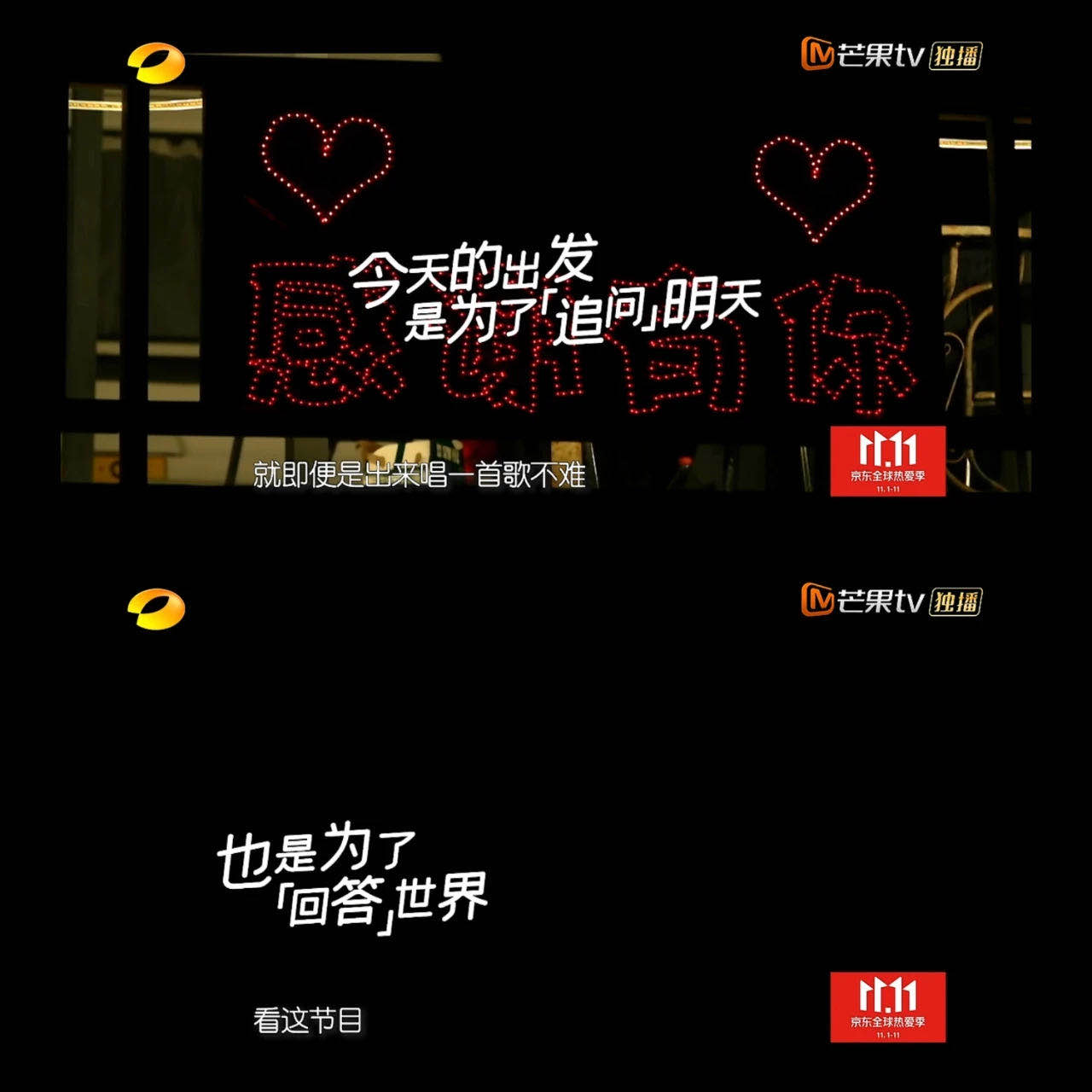 "今天的出发是为了追问明天,也是为了回答世界。"所有的答案在追寻的过程中一起寻找,这个文艺和抽象的回答实则也避开了综艺向的剪辑思路。
