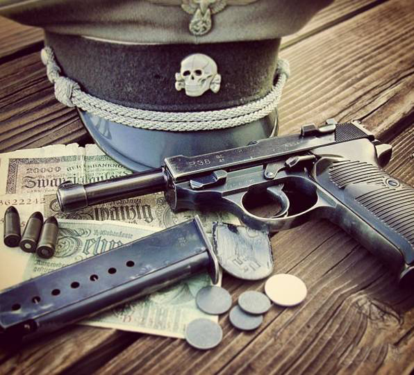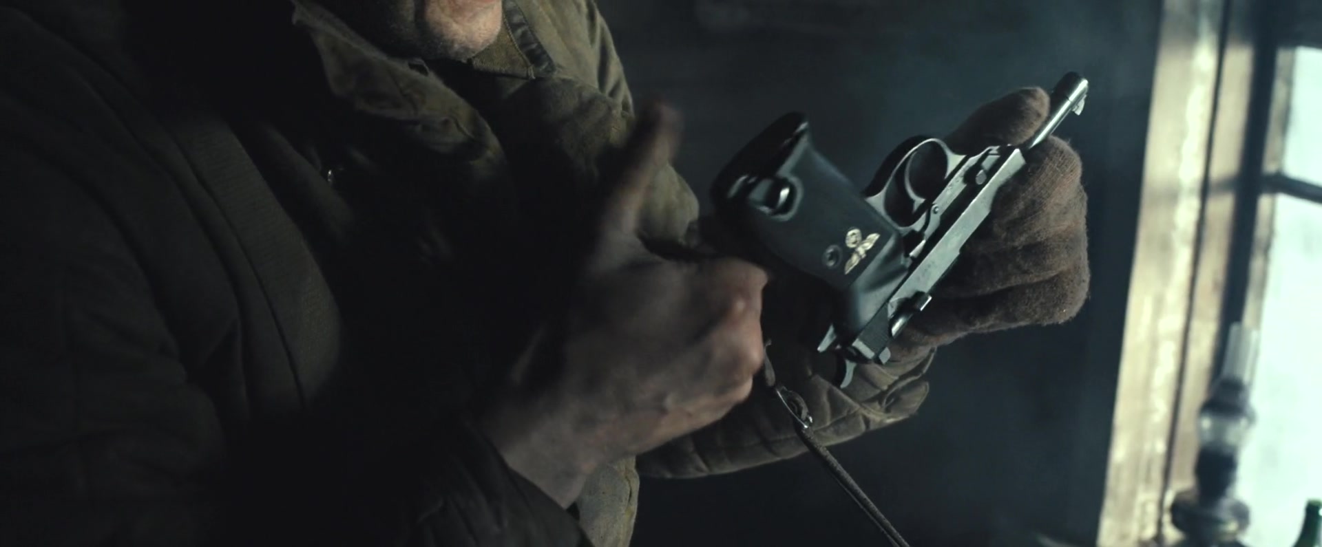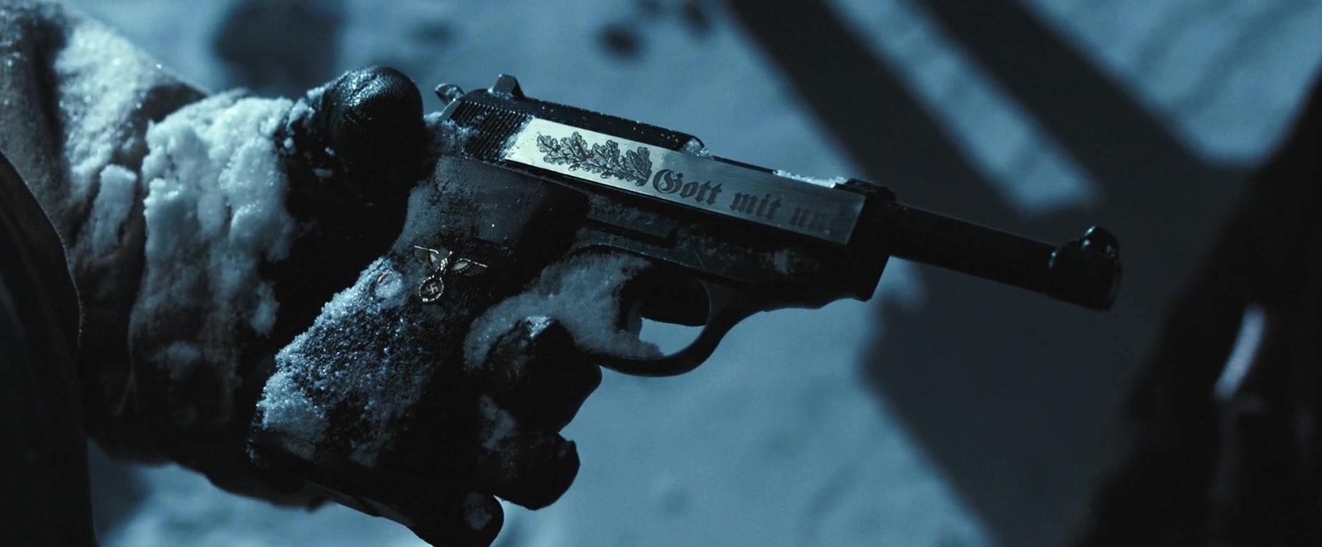 电影中最引人注目的枪械是一支非常特别的德国瓦尔特p38手枪,这把枪的工艺相比其他同型号的枪明显更精美,应该是纯手工定制的,金属黑的枪身上刻有文字和花纹,黑色胶木手柄上还有闪着金光的纳粹鹰徽的,仔细看,还可以隐约看到鹰头向右,纳粹德国陆海空军的鹰徽都是向右的,但政务机关,国家机关或诸如警察部门和秘密警察的鹰徽是向左的,鹰头向左的部门,大都是的内政机关的标志,鹰头向右的部门,大都是海陆空军和党卫军的标志,这把制作精美的p38无疑是高级军官所使用的。