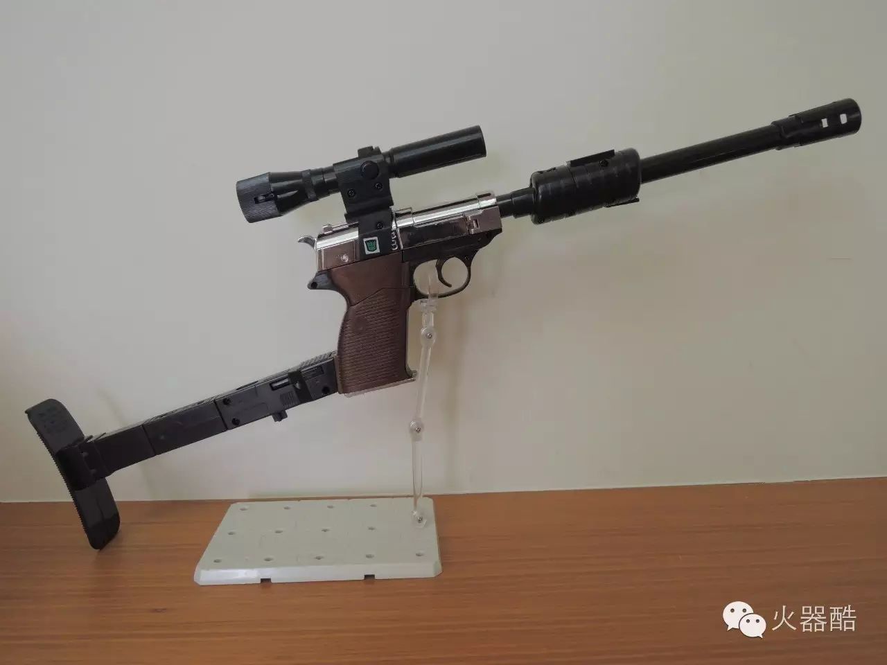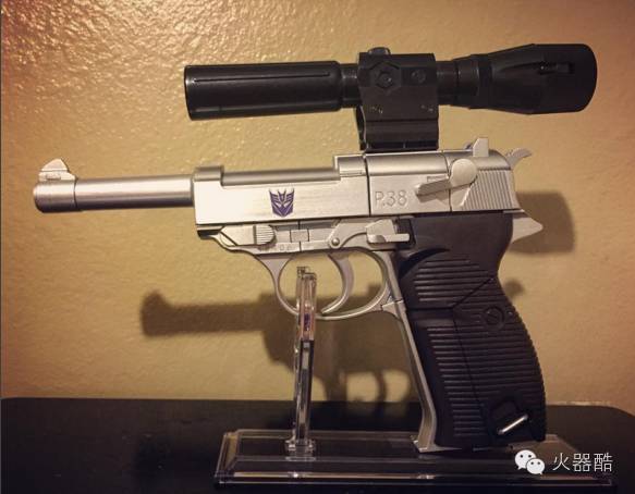这款手枪中最特别的是狙击型p38,据说这种加装了消音筒、光学瞄具和抵肩枪托的狙击型p38出现在了007电影中,是老版g1变形金刚动画里威震天的原形。