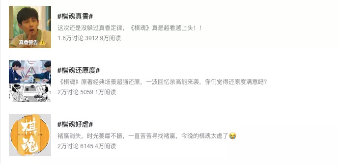 此外,剧情相关的话题也在网络上引发了诸多热议。具体来看,微博主话题#棋魂#有64.4万讨论、10亿阅读,#棋魂看哭了#有4万讨论、1.6亿阅读,#棋魂真香#、#棋魂还原度#、#棋魂榴莲剧#、#棋魂垂直入坑#等话题引发较多的关注。对于一部小体量、轻成本的网剧来说,能够取得这样的成绩实属难得。