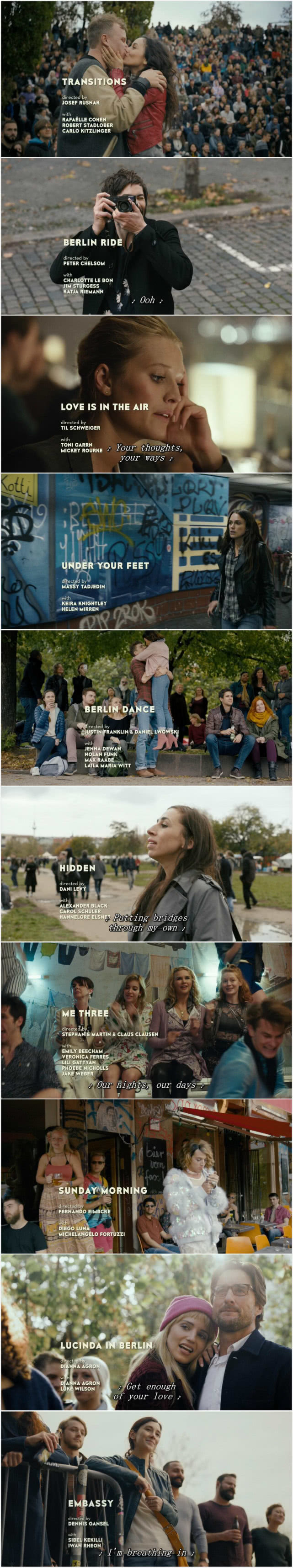 2小时片长的《柏林,我爱你》上演了10个故事,《transitions》、《berlin ride》、《love is in the air》、《under your feet》、《berlin dance》、《hidden》、《me three》、《sunday morning》、《lucinda in berlin》、《embassy》。