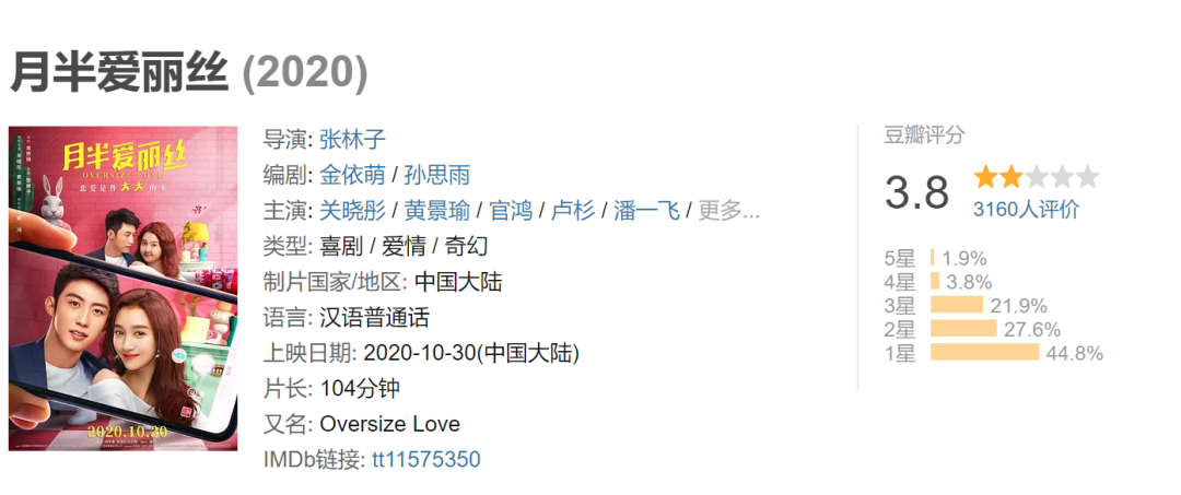 10月30日,关晓彤和黄景瑜主演的电影《月半爱丽丝》在各大影院上线,这部作品在上线一天之后豆瓣给到了3.8的低分,可谓是评分扑街。