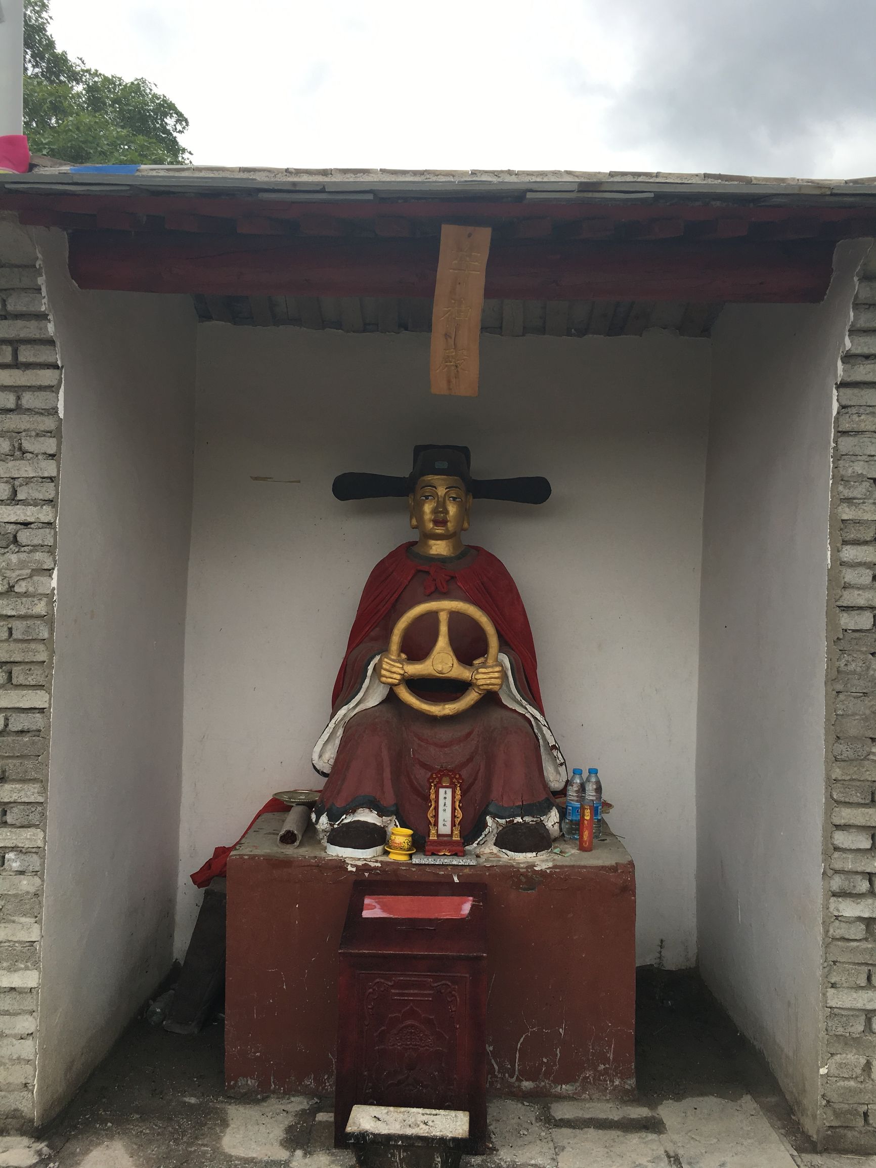 这个位于北京市房山区十霞路黑水峪的车神,十分与时俱进。他手里端着一个法器:竟然是方向盘!眉毛高挑,眼睛直视前方,好像是在开车的样子…