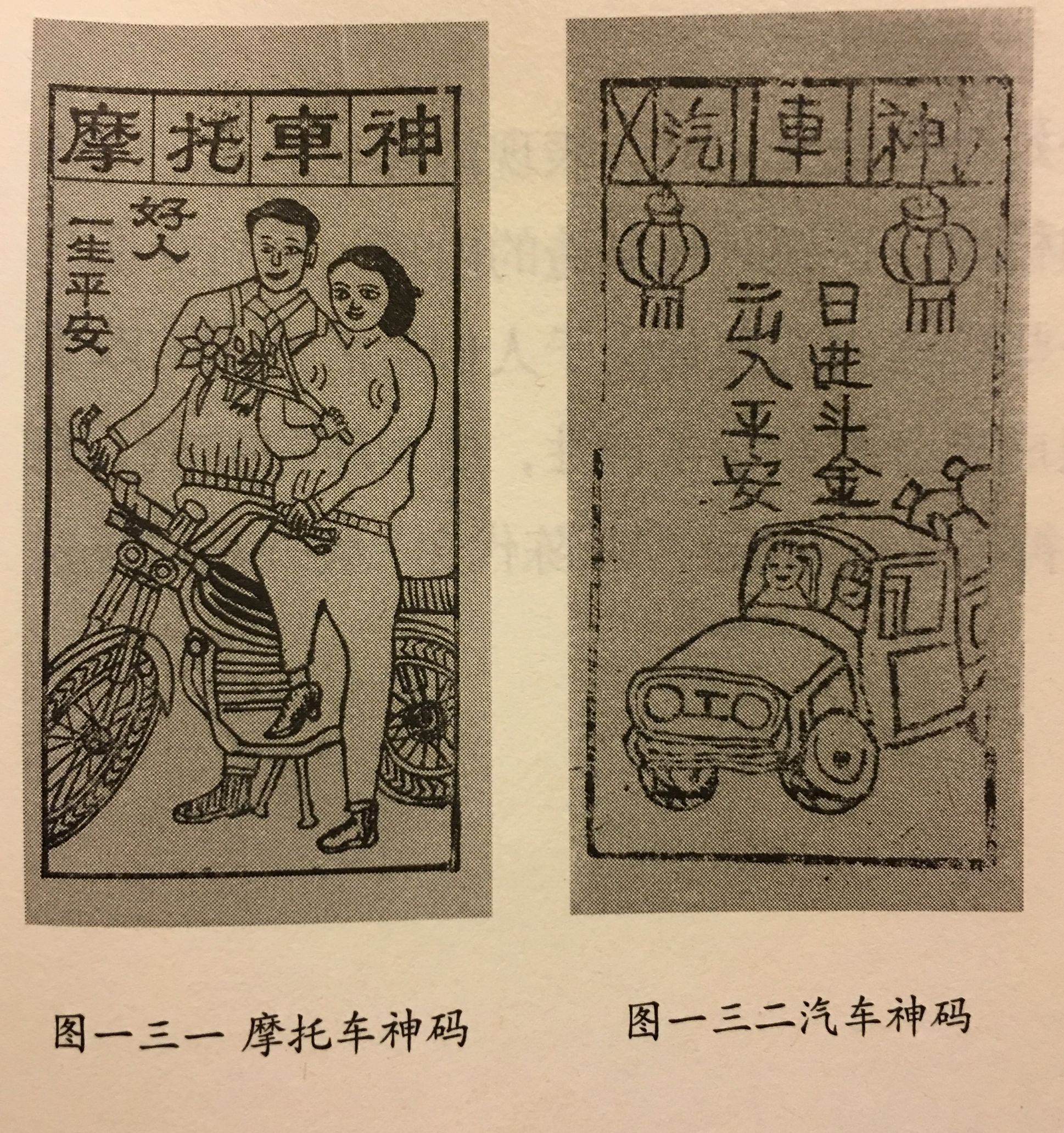 有时候它没有姓名,就叫“车神”,甚至还有内丘县出产的“神禡”,是一种印在纸张上的神像。不但有总管的车神,还有具体细分的“摩托车神”和“汽车神”:
