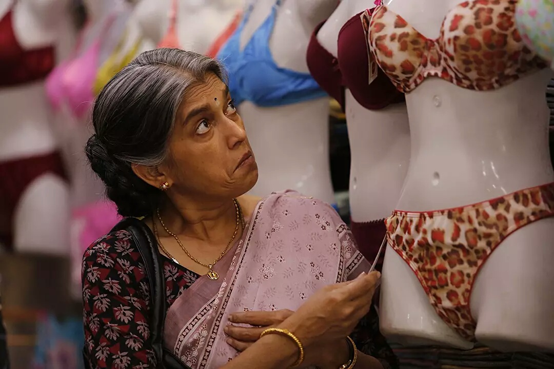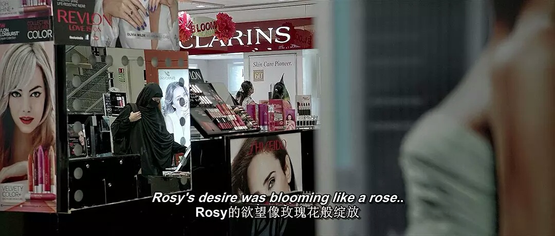 一开场,她就在商场里极为熟练的偷口红,对着镜子细细抿开,再出现在大众面前的时候,已然是不属于印度保守社会的『摩登女孩』样子。短衫、牛仔裤、大红唇,完全不同与在家里裹得只剩下眼睛的守旧装束。
