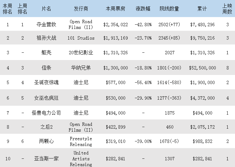 本周北美影市平平淡淡,只有两部影片上映,其中20世纪影业的惊悚电影《躯壳》杀入前三,成绩为131万,还算过得去,而open road films (ii)发行的爱情电影《之后2》则仅列第8,其他电影则不同程度下跌。具体情况请看下列榜单。