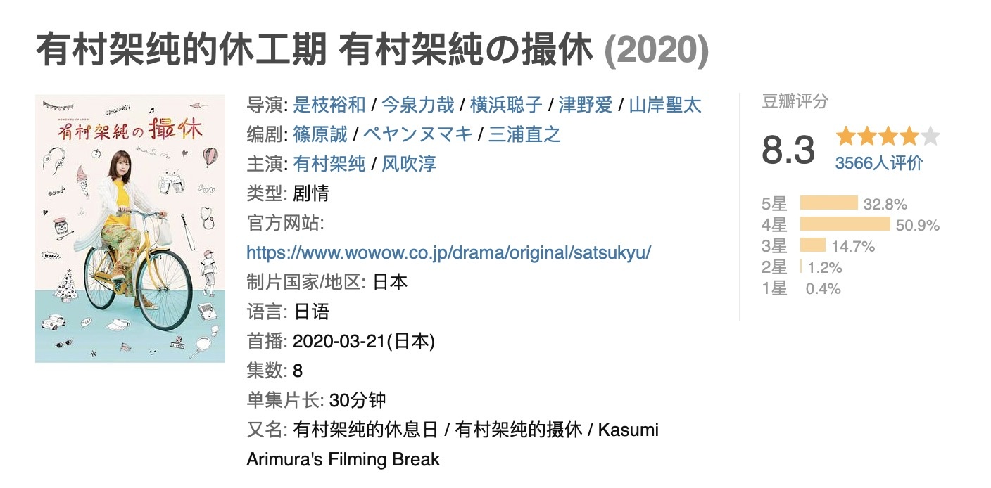 《有村架纯的休工期》于今年3月21日首播,操刀第一集的正是著名导演是枝裕和。在第一集中,有村架纯回到老家,与母亲和一位神秘男子共同度过假日。短小精悍的篇幅和清新治愈的画风,令其一经上线就收获了不少好评。