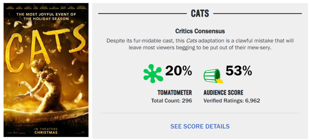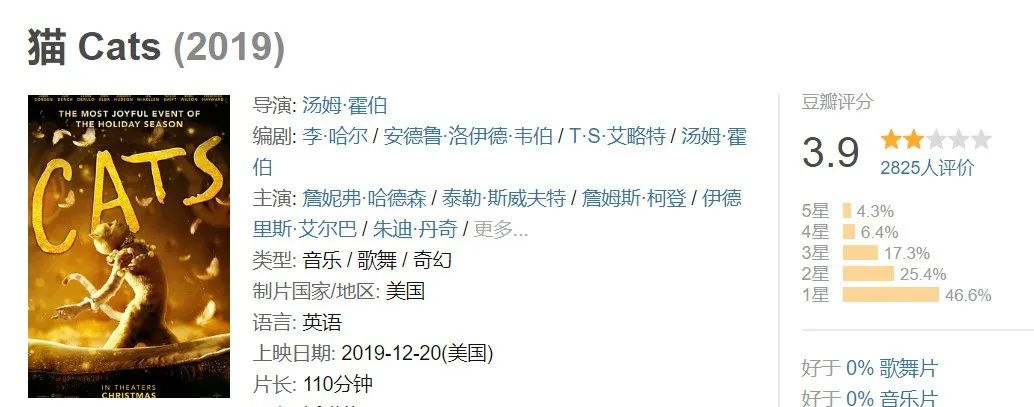 《猫》由安德鲁·洛伊德·韦伯的经典音乐剧改编,汤姆·霍伯(《丹麦女孩》《悲惨世界》《国王的演讲》)执导,有着名导、影星、歌星、顶尖舞蹈演员齐聚的卡司阵容,9500万美元的预算,怎么就拍成了观众的噩梦?