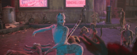 这些专业舞蹈演员的加盟,让影片的舞蹈质感得到了很大提升。但是,对于肢体控制力没那么完美的歌手和演员来说,就不太妙了。这是《猫》的另一大尴尬问题:猫的造型太考验体态和身姿了,毫无遮掩余地。