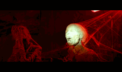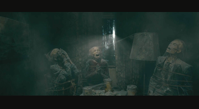 三个干尸都被捆绑着,表情痛苦,生前受到过非人待遇。餐桌上瓶子还摆放着从他们各自身上割下的部位,场面极其恐怖。