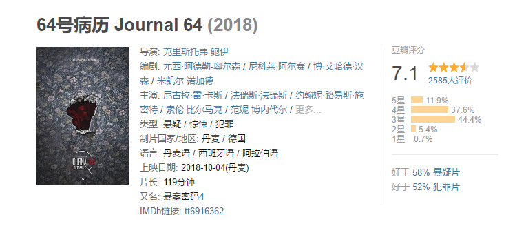 带着好奇,惊悚地的心情看电影,却只看到一点点“吓人”,揭开电影背后的意义的那刻,才显得更加值得观赏。这是一部丹麦的悬疑犯罪电影,改编自丹麦小说家尤西·阿德勒-奥尔森(jussiadler-olsen)的小说《悬案密码》,影片也刷新丹麦的票房纪录。