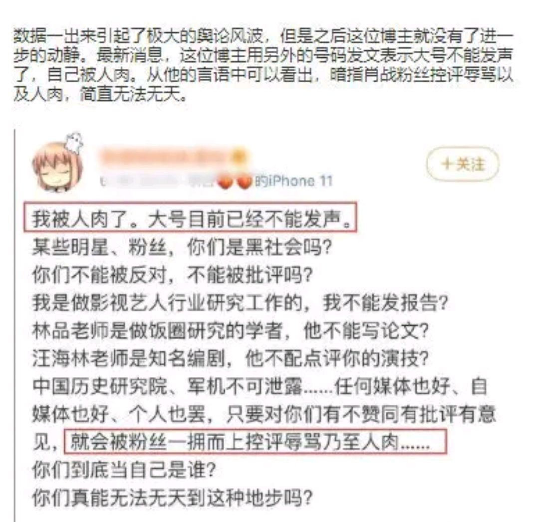 就如同这个大v一般,经常会评价肖战一些事情,近日却遭到了所谓“肖战粉丝”的围攻,被进行了人肉搜索,导致自己的账号无法正常使用。