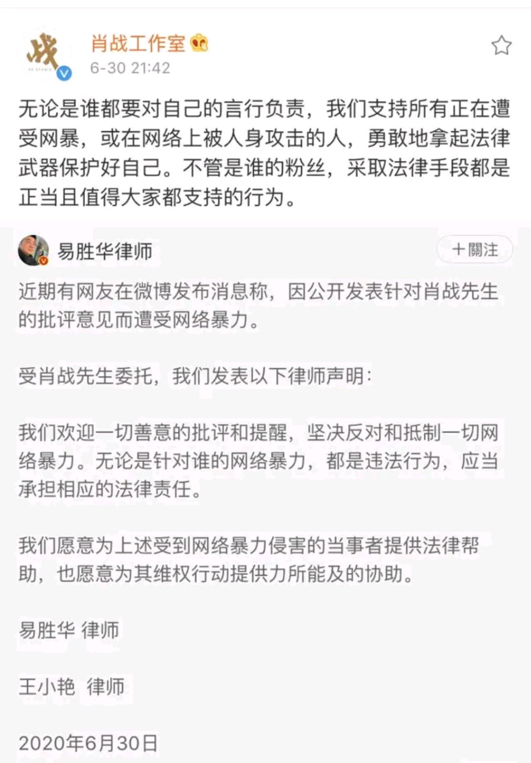 肖战工作室为这位大v提供了免费的法律援助,最终事情会水落石出,到底是不是“肖战粉丝”围攻了他,静待佳音吧。