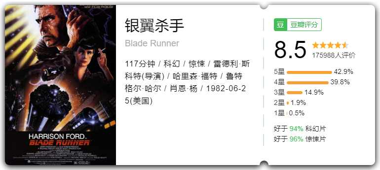 这片怪我,我一直以为早就推过了,我又怎么可能会忘记推这部经典的科幻片?没想到只推了一部《银翼杀手2049》,今天就补上吧。无论哪个机构的排名,《银翼杀手》总是在最佳科幻片中排前两名。唯一能跟其竞争榜首的,只有库布里克的《2001太空漫游》。黑色电影的打光和基调+冰冷颓废的赛博朋克主题+节奏缓慢的文艺范。电影的迷幻配乐极佳,特效和美工妙到颠毫。导演剪辑版奉上!ps:和2049放在一起了!