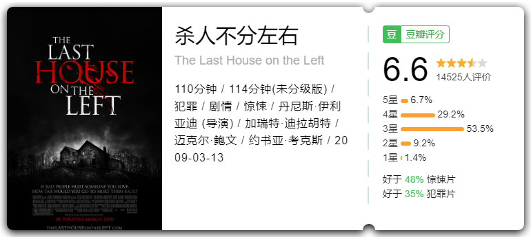 《杀人不分左右》又名《魔屋》,是由韦斯·克雷文执导, 加瑞特·迪拉胡特、迈克尔·鲍文、约书亚·考克斯等主演的恐怖片,2009年上映。故事讲的是四个罪恶累累的恶棍劫持了两个中产家庭的少女,对她们进行轮暴,虐待,折磨,最后残忍地杀害。随后他们无意中逃到其中一个被害女孩的家里躲避追捕。孩子的父母用更加残暴的方式来惩罚这些恶棍,为女儿复仇。