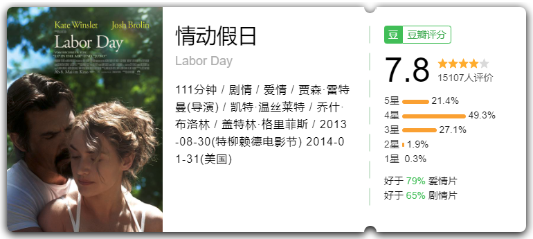 《情动假日》又名《劳动日》,是由凯特·温丝莱特、乔什·布洛林、加特林·格里菲斯、托比·马奎尔主演等主演的爱情片,2014年上映。讲述了单亲妈妈与儿子误将一名杀人犯带入家中,同一屋檐下的三人产生了不可思议的感情的故事。