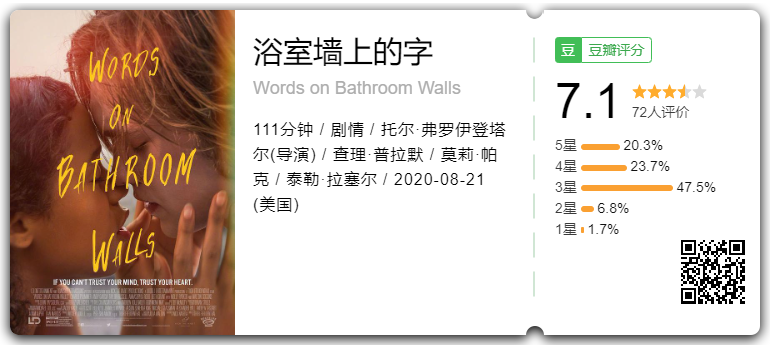 《浴室墙上的字》是由查理·普拉默、泰勒·拉塞尔、安娜索菲亚·罗伯等主演的剧情片,2020年上映。讲述高中生亚当患有偏执型精神分裂症,会产生疯狂的幻觉,他加入了一场实验性的药物试验,负责人承诺帮助隐藏亚当的梦中情人这个秘密,一开始效果看起来很不错,不过很快真相大白,他被迫做出一些艰难的决定。