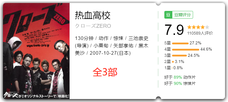 《热血高校》是一部根据同名漫画改编的动作惊悚系列,目前共3部,第一部由小栗旬、山田孝之、矢部享佑、远藤宪一、岸谷五朗、黑木明纱、桐谷健太、高冈苍甫等主演,讲述的是在一所恶名远播的叫“铃兰男子高中”的学校中,一群嗜好打架的不良学生之间的帮派之争。