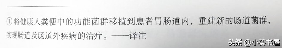 原作者大卫介绍对细菌的最新研究时,提到老鼠的行为可以通过注入新的肠道菌群而被改变(尤其是冒险性格)。接着,大卫联想,是否人类的羞怯可以通过粪菌移植治愈呢?不过他没有解释,什么是粪菌移植。译者在注释中,简单扼要地说明了这个词的含义。