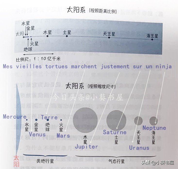 上面这句话是法文的原文。这句话里,每个单词的首字母都和太阳系八大行星的首字母相同,而且这句话里按照词语顺序所对应的行星顺序,也与八大行星距离太阳远近的顺序相同。 (可以参考下图看这段文字)