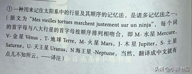 书中第九章《月亮是从哪里来的》提到了记忆太阳系行星和行星顺序的一句法语。这句话翻译成中文是“我的老乌龟们正好走在一位忍者上”。这句中文不论是含义还是词语,都和太阳系行星风马牛不相及。那法文原文和太阳系的八大行星有什么关系呢?