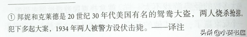 我最开始以为这就是普通的两个外国人名,看了译者注释才知道:这两个人是美国近代著名的鸳鸯大盗。我这才感到,大卫不是随便起了个名,而是特意使用这两个名字代指罪犯。