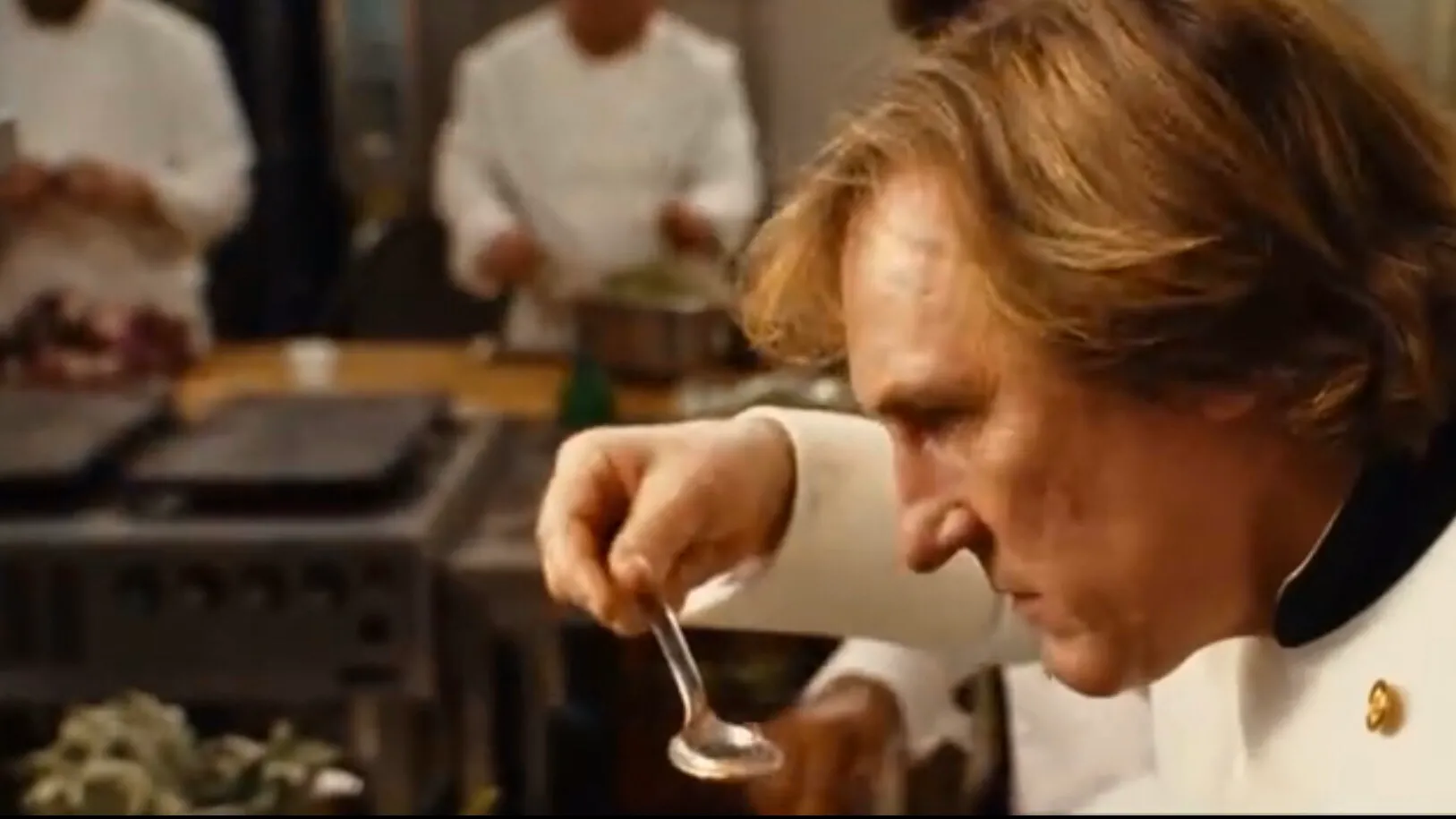 在影片中,德帕迪约扮演的名厨戴笛尔是个不攀附权贵,对美食情有独钟的可爱的小老头儿。在乔姬娅第一次去餐厅,她一个人就点了戴笛尔当晚菜单上所有的菜,而且不同于其他桌的客人,乔姬娅完全不做任何修改,这自然引起了戴笛尔的好奇,于是亲自出来见见这位来自美国的、跟他一样真正爱美食的客人,对于另一桌等着见他的政客和商人却视而不见。