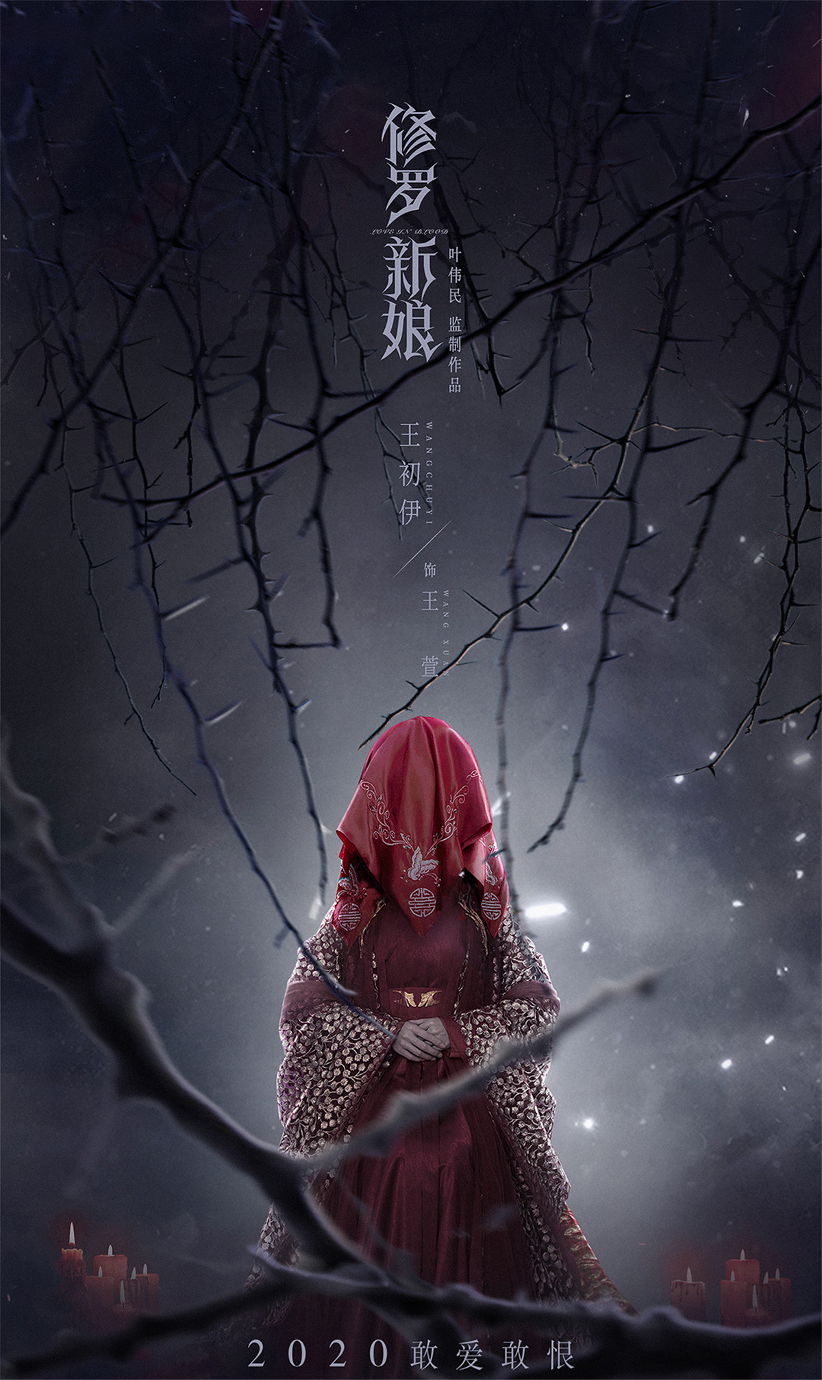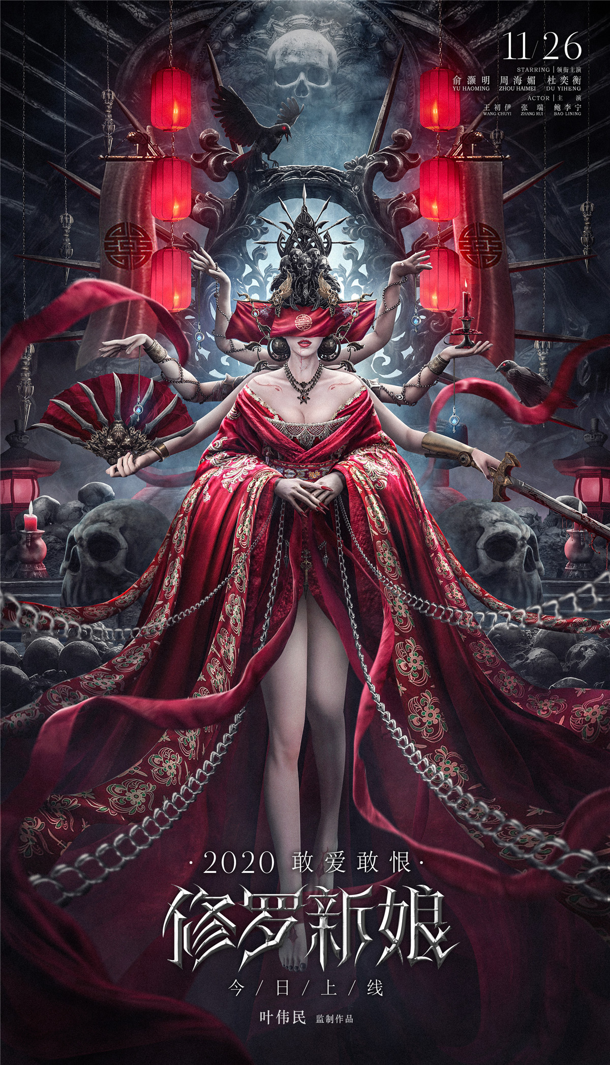 同天曝光的上线主海报,嫁衣新娘表情肃穆,红纱遮眼,血泪泣下。新娘多臂造型具象化了修罗新娘的多面性,新娘一手执剑复仇一手执扇静挽,另外几支手臂,手内或执燃烧红烛,或悬着剔透的水晶眼泪,展现了修罗女尖锐和内心柔软的双面。乌鸦盘旋,红绸飞绕,惊悚唯美氛围感十足。
