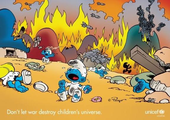 2005年,联合国儿童基金会发布了一支经贝约家人授权的反战宣传片,原本无忧无虑的蓝精灵在一片炮火中四散奔逃,结局是蓝宝宝被一群死去的蓝精灵包围着,正在嚎啕大哭,场面惨不忍睹。片尾出现一行标语:“别让战争毁灭孩子的世界”,以此呼吁国际社会关注处于非洲战火中的受难孩童。