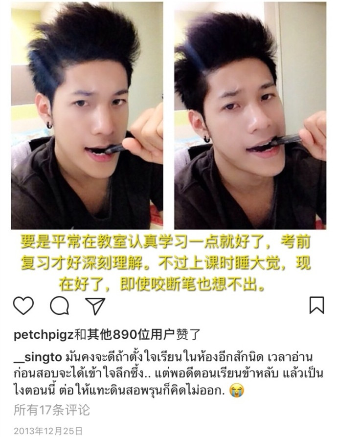 泰星singto和krist在泰国农业大学经济学院也是学长、学弟关系,singto3年前还是个单纯的、爱耍帅的小男孩,纠结于发型、肤色等细节。
