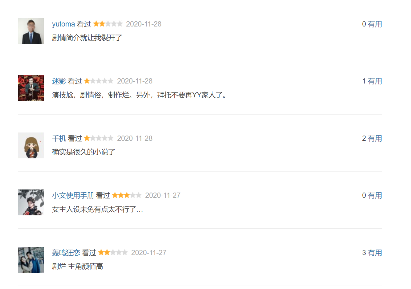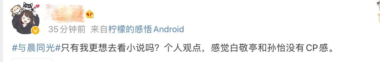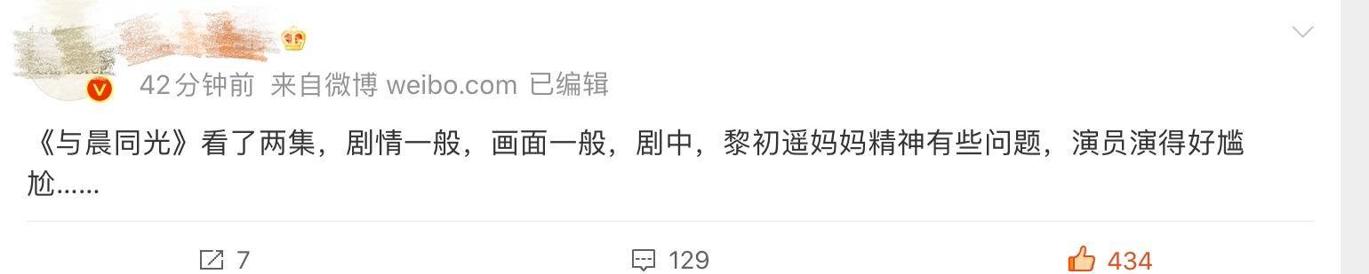 豆瓣虽然还没有开分,但网友满屏的一星和两星差评,刚开播两集口碑就崩了。从原著小说太老、男女主演技差、人设问题、剧情俗套、制作烂等等,《与晨同光》各个方面都成了网友吐槽的重点。