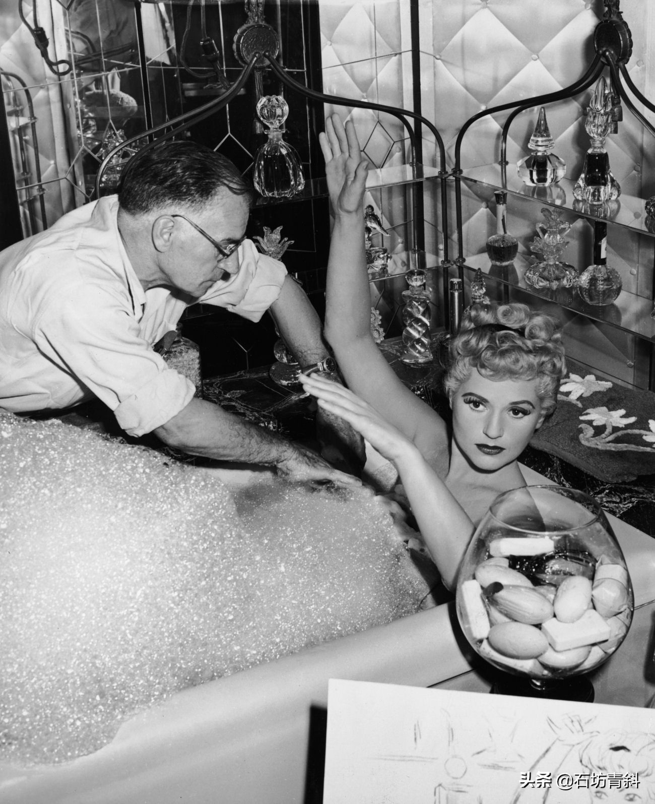 电影《绛帐海堂春/出位妙女郎born yesterday》(1950)片场,工作人员帮朱迪·霍利德judy holliday清理泡沫,避免挡住镜头