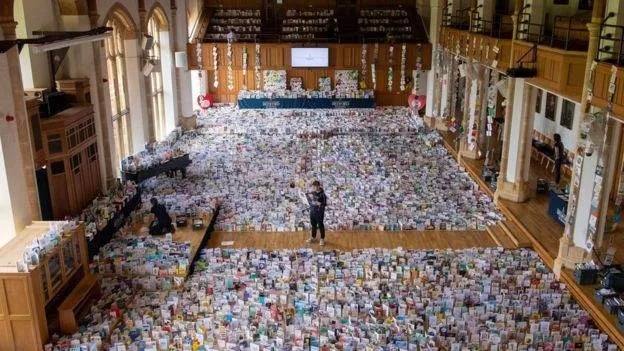 世界各地寄来的生日贺卡总数超过了14万张,当地邮局负责人斯蒂芬·詹姆斯(stephen james)表示,自己在邮局工作了这么久,从来没有看到过一个人收到如此多的贺卡。为了将大家的心意展示出来,汤姆上尉的家人和邮局一起借用了当地贝德福德学校的礼堂来展示这些贺卡,学校礼堂的舞台上和周围摆满了打开的贺卡,非常壮观。而其中最特别的一张贺卡来自英国女王:“我很高兴得知您正在庆祝自己的一百岁生日。我也很高兴听到您最近在这个困难时期为nhs慈善组织筹款。在这样的特殊场合,我向您表示祝贺和最良好的祝愿。伊丽莎白·r。”