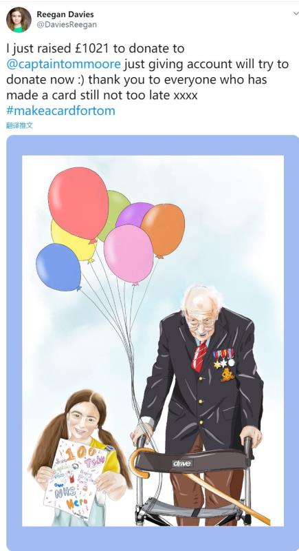 8岁的里根·戴维斯在社交平台上晒出自己给汤姆上尉的生日贺卡,还录了一段视频,号召小朋友们一起来为汤姆上尉手绘生日贺卡,“我从未见过100岁的老爷爷。”在里根眼中,汤姆上尉不但是战争中的英雄,现在更是国家的英雄。随着小里根的这段视频迅速在各大社交平台上流传,小朋友们用五颜六色的画笔,绘制生日贺卡,并把自己想对汤姆上尉的祝福写下来,然后发到网上。几乎每时每刻,都有小朋友的贺卡和视频上传到各大社交平台。