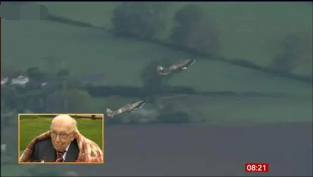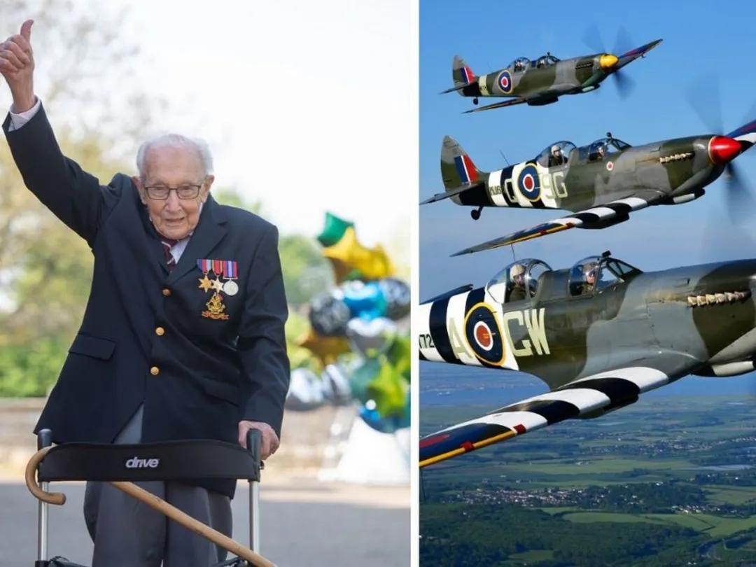 4月30日上午8时,英国皇家空军的两架二战历史名机——一架“飓风”和一架“喷火”,熟悉二战历史的人都知道,这是在著名的不列颠空战中挽救了英国的两款功勋战机——从林肯郡的科宁斯比空军基地起飞,经过大约110公里的飞行,飞抵贝德福德郡的马斯顿·莫雷顿,一位百岁二战老兵汤姆·摩尔(tom moore)家的上空,绕着他们家的小院飞了三圈,以此向他表示生日祝福和致敬。