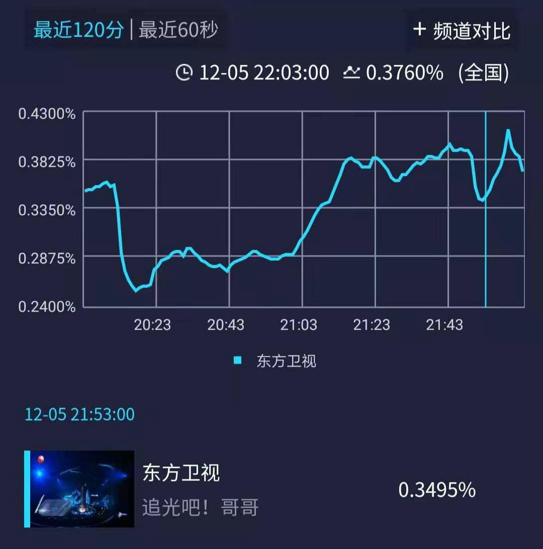 12月5日晚间,男团选秀节目《追光吧!哥哥》东方卫视和优酷视频平台同步开播。优酷方面暂时无法查明具体的播放数字。而东方卫视方面,呈现到csm和酷云实时上的双网收视率情况,均不容乐观。