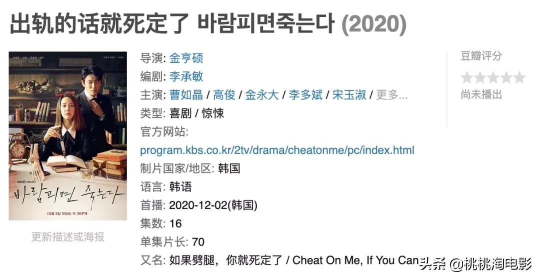 这个剧呢,听片名就很有意思。而且,女主曹如晶就是《寄生虫》里面富人家的太太,之前翻译成赵茹珍吧。而男主则是高俊。