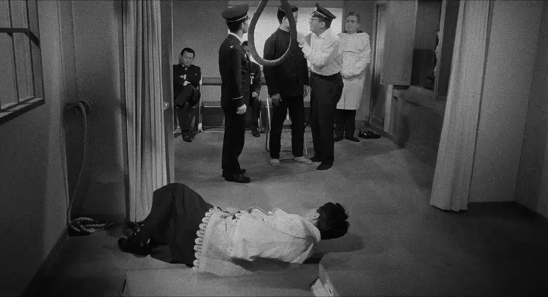 电影开片的第一个镜头是在日本监狱大院一角的死刑室,朝鲜犯人r因奸杀两名日本女孩正在被处以绞刑。可行刑之后r并没有死,而是丧失了记忆。依据日本法律,对于不记得自身罪行的罪犯不得行刑,执行死刑的监狱官员便讨论到底该如何处置他。最终他们决定要恢复他的记忆然后让他认罪。于是,他们便重演r的早年生活和犯罪场景以唤醒他的记忆。然而,由于重演过程中太过真实激烈,其中一名官员竟真的犯了罪……