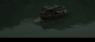 碧波江上,白十三和王子进的小舟慢悠悠地在江上滑行,周围一片自然风光,忽略在船下推着走的青蛙精,画面清爽干净,再加上两个悠闲的舟上聊天,自有一番妙趣横生。
