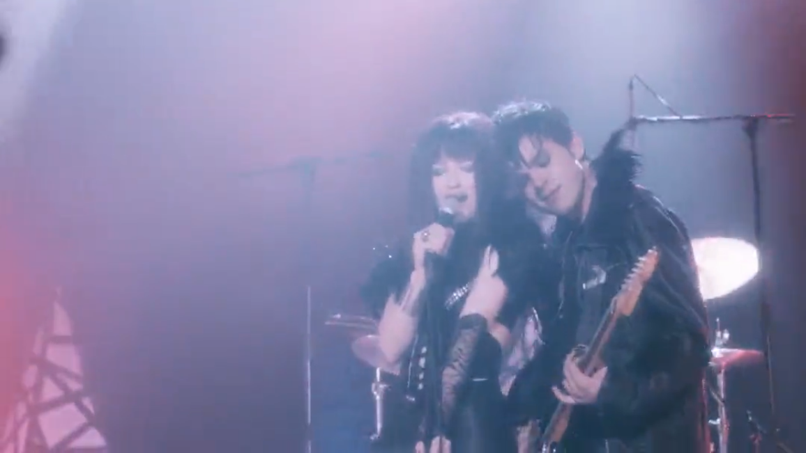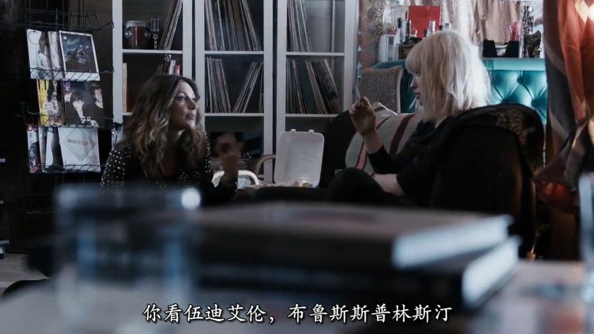 镜头切向女主了。女主和她的哥哥组建了一支人气很旺的摇滚乐队!看这个画面,大家应该能看出是什么摇滚风格了吧?这是在刻意模仿华丽摇滚the suede(山羊皮乐队),吉他手的烟熏妆有点模仿后朋克乐队the cure!反正从电影中播放的音乐中听出,乐队玩的是新浪潮电子乐加华丽摇滚!