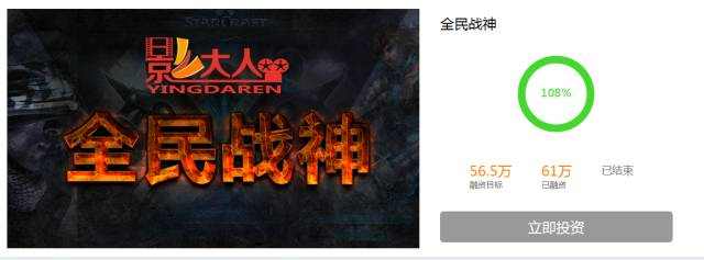 东阳映月(北京)影视文化传播有限公司、深圳战神互动娱乐、影人圈、北京影大人科技有限公司联合出品, 影大人众筹项目《全民战神》于2017年10月9日完成投资人本金结算。