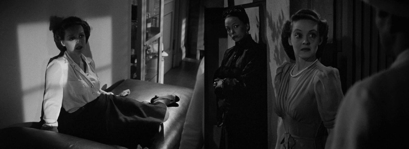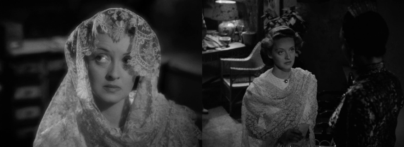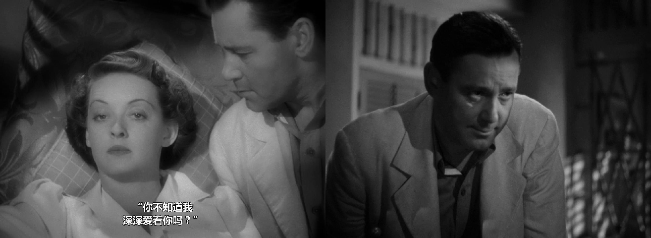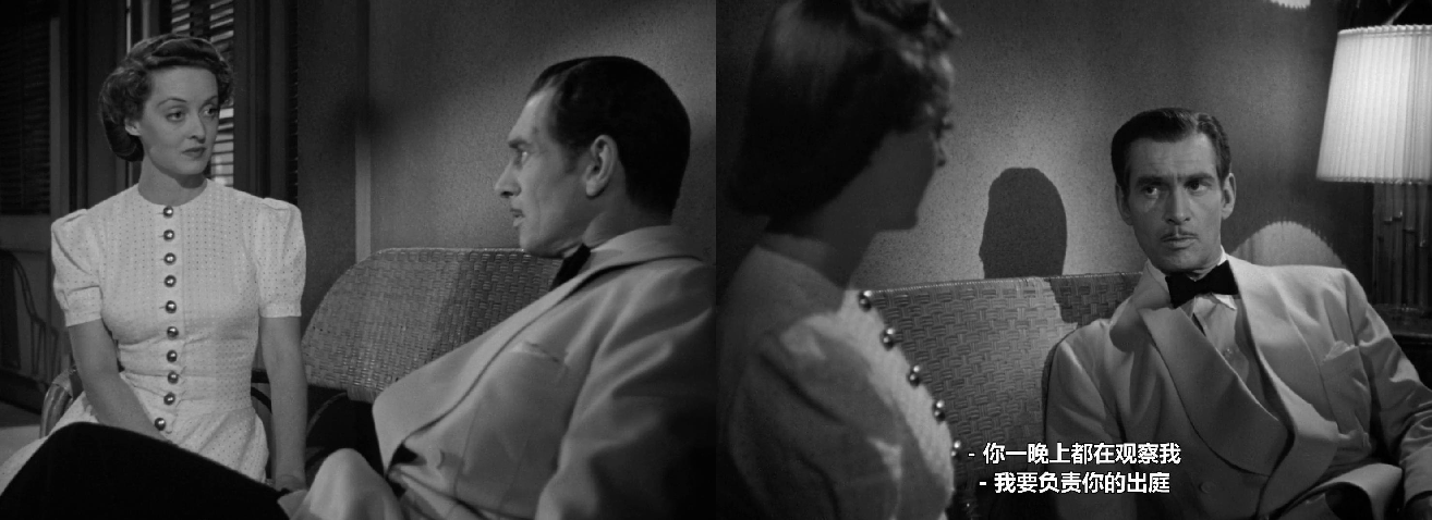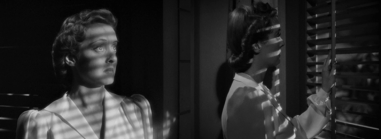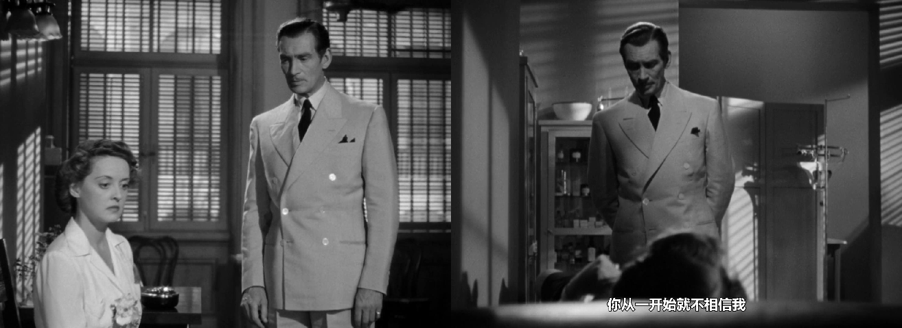 对光影运用和构图设计上,有着强烈的表现主义特点,高光比的布光方式,注重明暗反差与阴影的凸显,女主角的面部时常处于阴影之中。百叶窗成了天然的道具,透过百叶窗的光线成了明暗交织的“条纹状”,那种暧昧、迷离、诡谲的油然而生。当光线投射到女主角贝蒂·戴维斯身上忽明忽暗自然分割,这种人性审判的意味自然是不言而喻的。在摄影调度的完美支持下,贝蒂·戴维斯的眼神呈现出了更为复杂的含义。