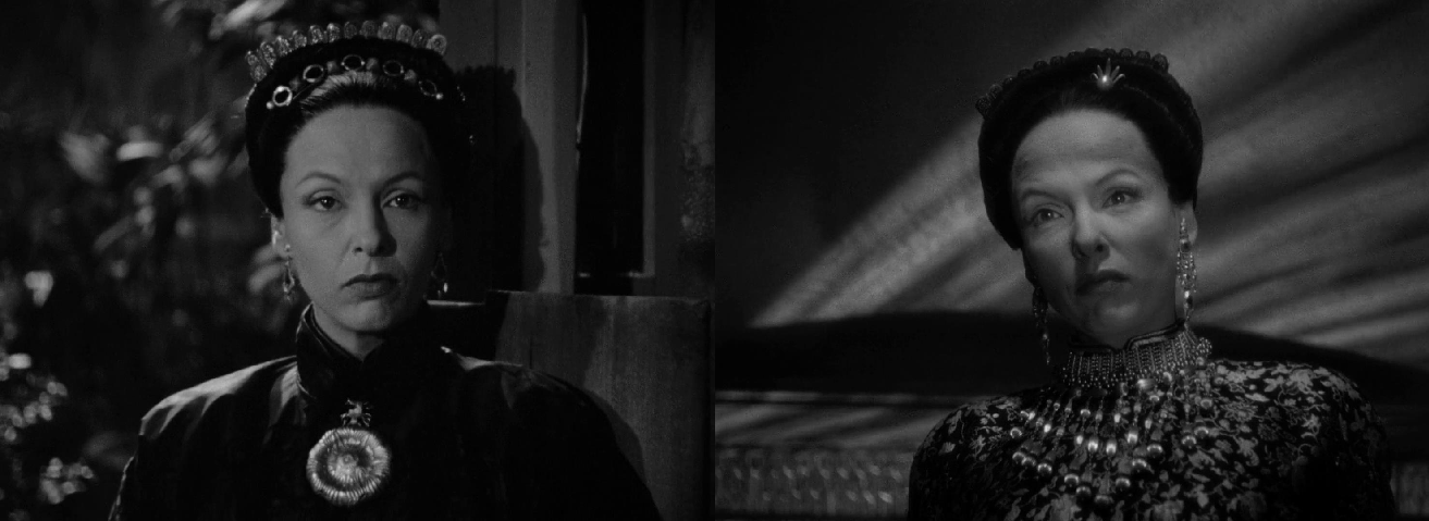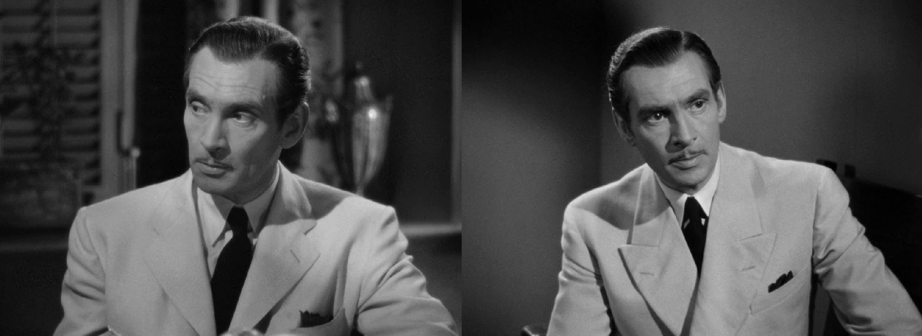 此外,人物于整体构图中的位置设计更是经过精心修饰的。女主角莱斯利骗过了丈夫、评审团居于所处关系网中的强势地位,但在和恋人的马来西亚当地夫人的对峙中,一直处于一种弱势地位。例如,莱斯利总是居于明处与低处,对方居于暗处与高处;莱斯利用钱买掉重要证据信物时,对方用充满鄙夷与不屑的眼神蔑视她并将钱丢入地上;扮演者形象气质还是眼神无疑比女主角贝蒂·戴维斯更为阴冷凌厉。