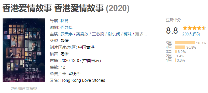 《香港爱情故事》于12月7日开播,共计12集,截至目前只播出了两集,但在豆瓣平台,评分飙上了8.8分,是2020年评分最高的一部tvb剧。
