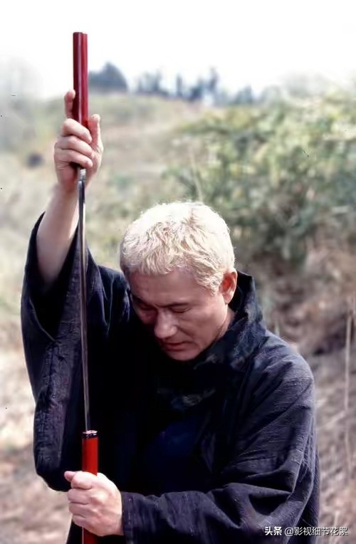 北野武扮演的 市,黄短发,身着蓝衫,手里形影不离的血红色拐杖~也是武器!
