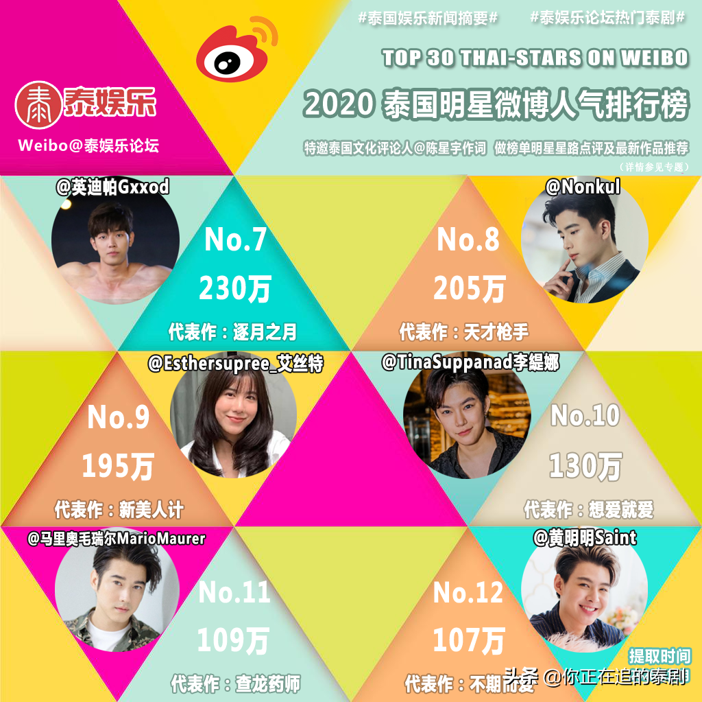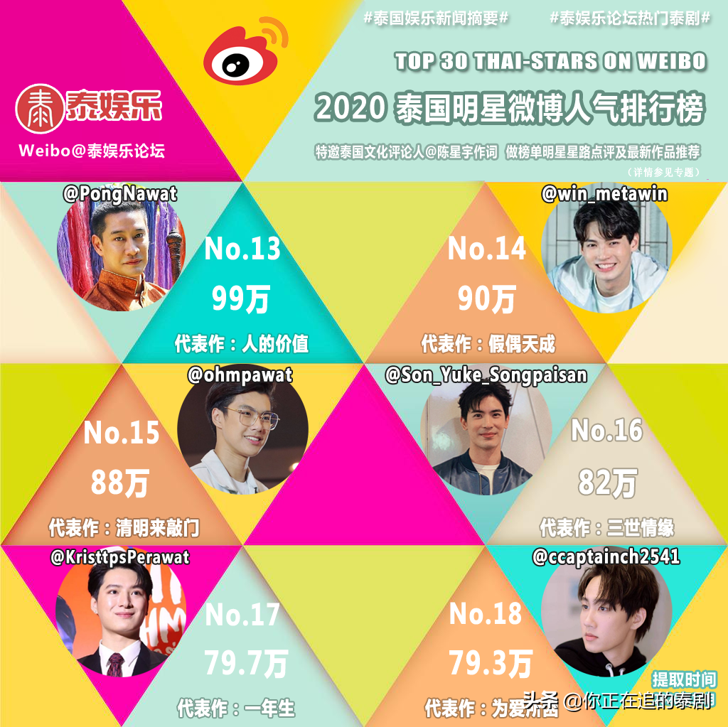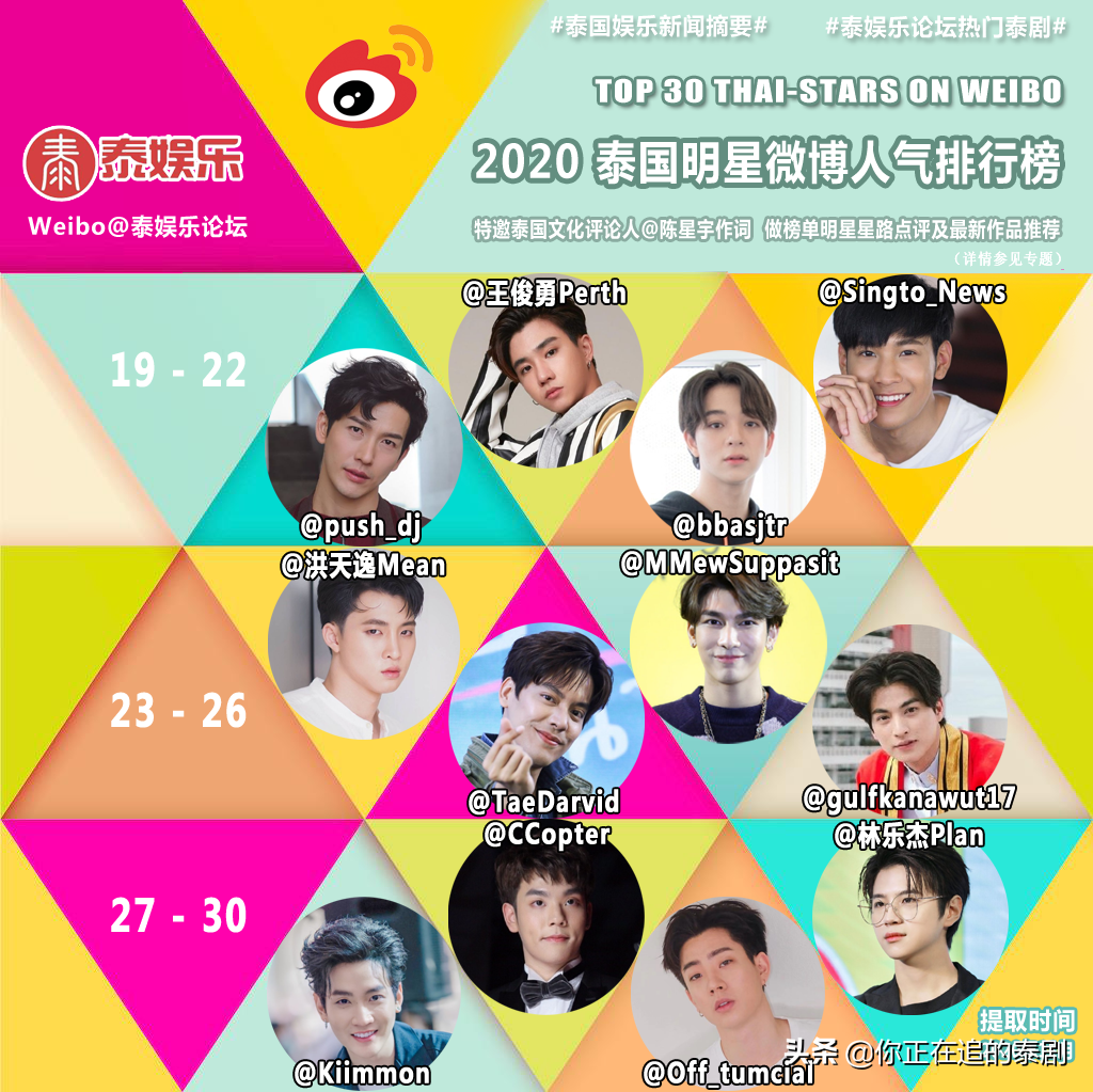中国泰娱乐资讯网(泰娱乐论坛平台)近日对外发布了《2020泰国明星微博粉丝量人气排行榜(top 30 thai-stars on weibo)》,整理了截止到2020年11月的微博平台数据。榜单前十位变化不大,但是随后的名单里出现了几位新鲜面孔,尤其一些新生代偶像的粉丝量在急速提升,而且可以明显发现活跃在微博的泰国明星中,95后年轻男偶像们占据了大多数,他们正在快速俘获中国粉丝,不断地增加他们各自在中国市场的曝光。